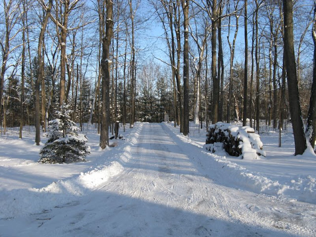 Esta foto foi tirada de costas para a nossa garagem, e mostra a entrada e estrada de acesso a nossa nova casa. O sol descobriu e fica tudo muito mais bonito. Hoje tivemos mais um dia de neve mas, segundo a previsao, os proximos devem ser solarengos e secos. Ainda vao continuar a ser frios, por isso a neve vai ficar onde esta.